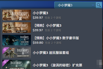 1、玩家在游戏商品平台直接搜索游戏,可搜索游戏中文名称“小小梦魇3”。