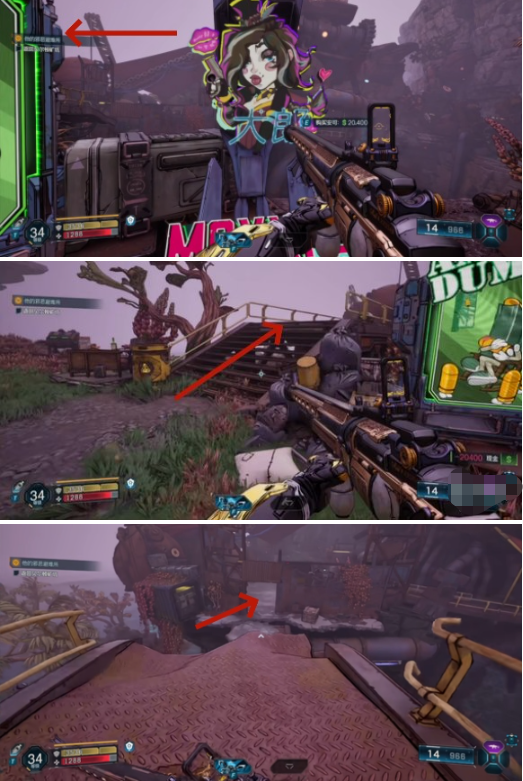 到达这个位置,寻找图中目标(找到这个安可机),交互之后视角向左转动,找到这个断桥,向着断桥方向出发,到达大朗所在地(图中箭头方向)。