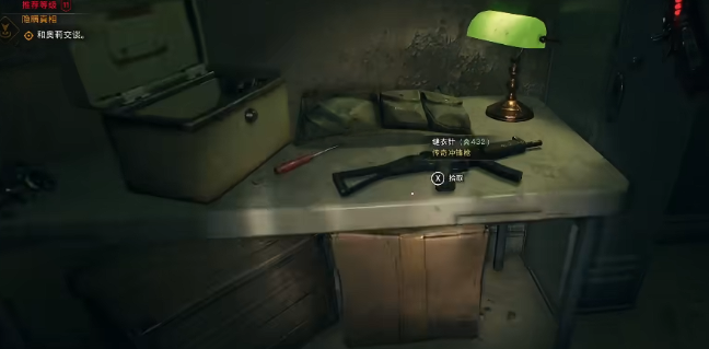 进入卷闸门内,撬开左边的门,缝衣针冲锋枪就在桌子上。