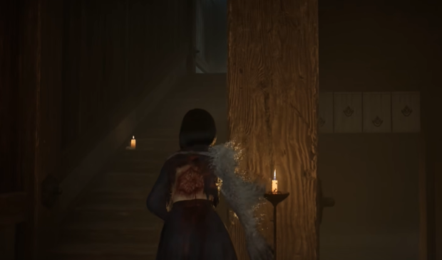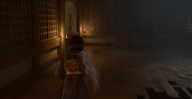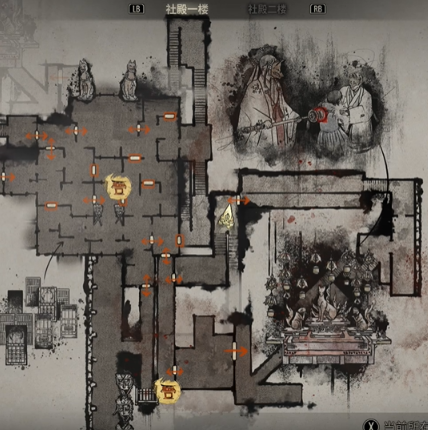 1、玩家先到达社殿一楼下图所示位置,左转向楼上走。