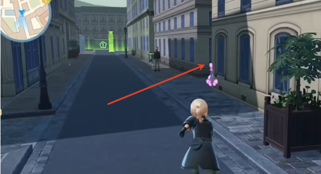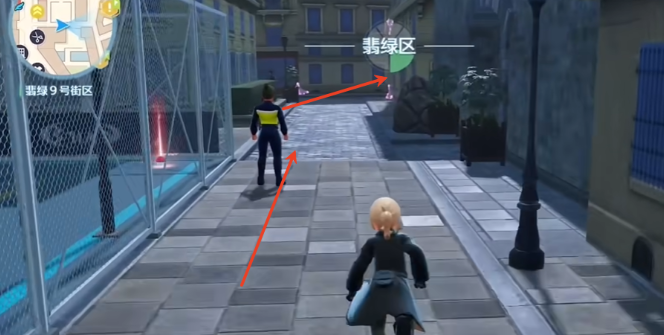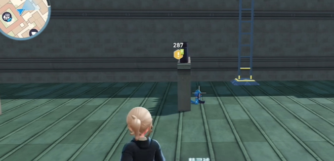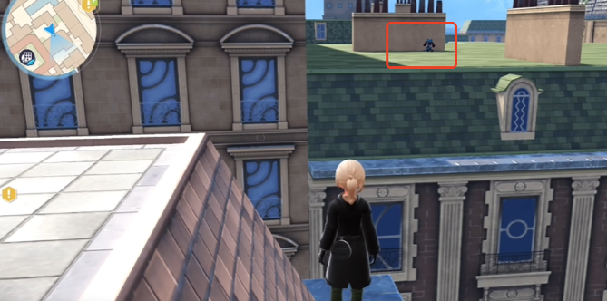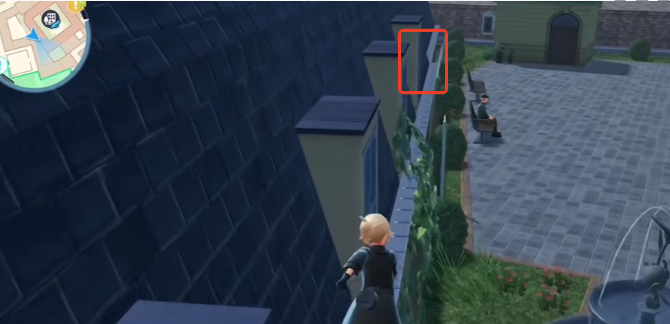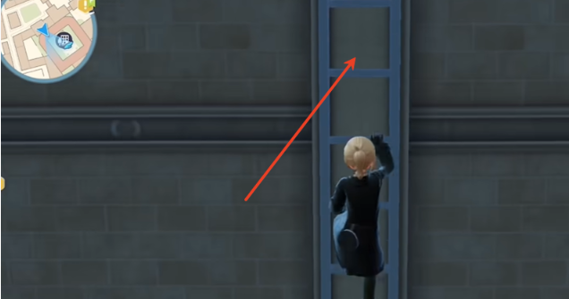 根据箭头走,到达对面楼的侧面位置爬梯子。